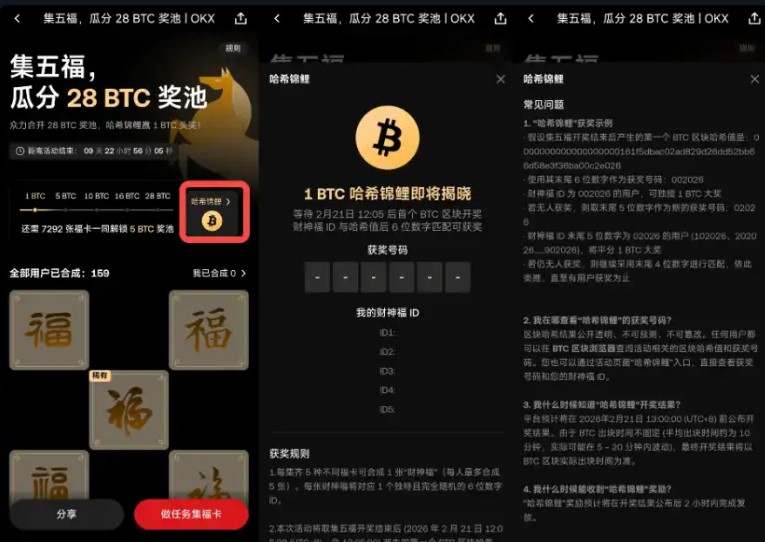 讓哈希見(jiàn)證每一次集卡與開(kāi)獎(jiǎng)的瞬間!「集五?!够顒?dòng)獲得的每張「財(cái)神?!苟紝?duì)應(yīng) 1 個(gè)獨(dú)特且完全隨機(jī)的 6 位數(shù)字 ID。該數(shù)字 ID 就是成為「哈希錦鯉」的關(guān)鍵,有機(jī)會(huì)獨(dú)攬 1 個(gè) BTC 大獎(jiǎng)!本次活動(dòng)將取集五福開(kāi)獎(jiǎng)結(jié)束后(2026 年 2 月 21 日 12:05 (UTC+8))產(chǎn)生的第一個(gè) BTC 區(qū)塊哈希值,并使用其末尾 6 位數(shù)字作為獲獎(jiǎng)號(hào)碼。