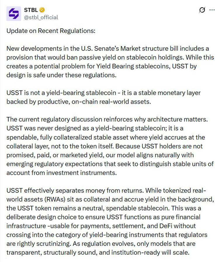 STBL 在 1 月 14 日的 X 文章中寫道,雖然基礎(chǔ) RWA 在背后積累收益率,但新的穩(wěn)定幣框架試圖將穩(wěn)定幣與收益分開,以避免近期對收益穩(wěn)定幣的監(jiān)管審查。