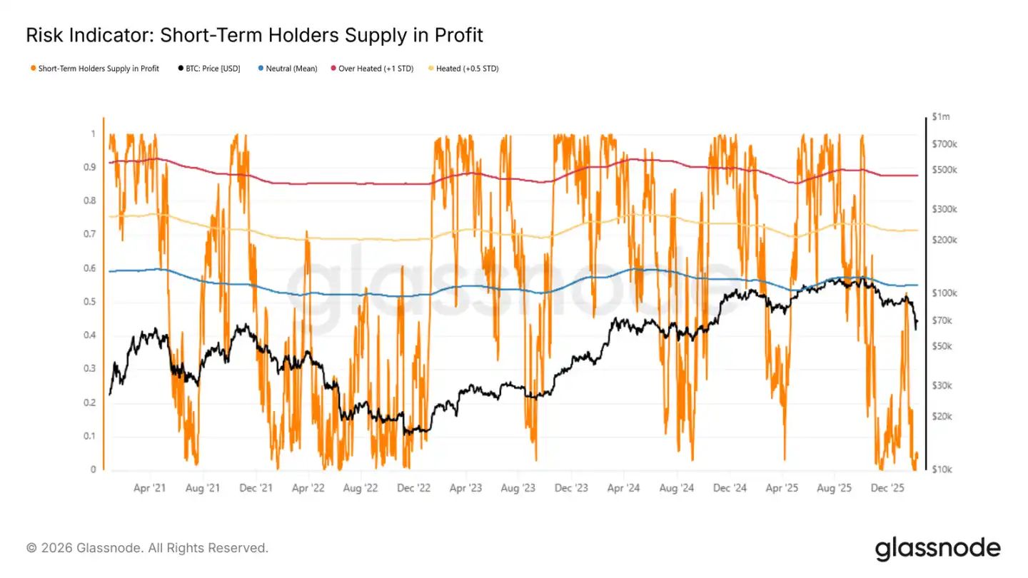 短期持有者盈利比例這個(gè)指標(biāo)很適合看這個(gè)。歷史上熊市反彈走到這個(gè)指標(biāo)的「均值到 +0.5 倍標(biāo)準(zhǔn)差」區(qū)間時(shí),經(jīng)常就漲不動(dòng)了?,F(xiàn)在這個(gè)數(shù)字只有 4.9%,說明絕大多數(shù)最近進(jìn)場(chǎng)的人還套著。盈利的人都很少,想靠他們?cè)冶P也難,但也說明市場(chǎng)很弱,沒有新錢進(jìn)來,反彈很難走遠(yuǎn)。