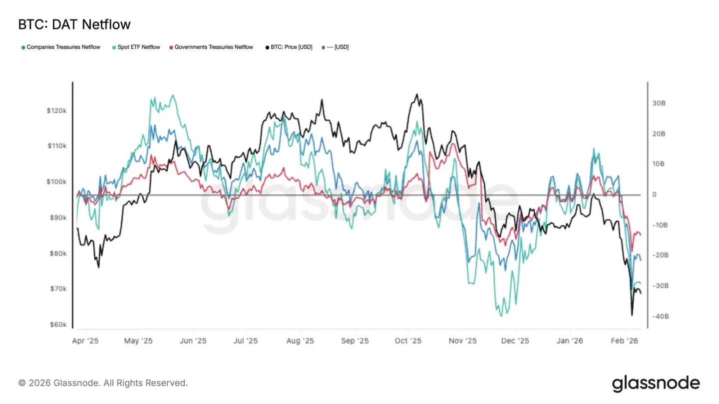 數(shù)字資產(chǎn)資金流最近轉(zhuǎn)負(fù)得非常明顯,ETF、企業(yè)、政府幾類機(jī)構(gòu)同時(shí)在凈流出,比特幣也打到了新低。ETF 是主力,企業(yè)和政府也在減,這不是某一家在調(diào)倉,是整個(gè)市場(chǎng)的機(jī)構(gòu)都在收縮。