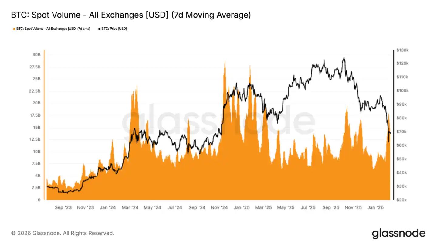 跌到 7 萬低區(qū)的時(shí)候,現(xiàn)貨成交量沖了一下,7 天均值也拉起來了。但這個(gè)量是跌出來的,大家被動(dòng)應(yīng)對(duì),不是主動(dòng)抄底。而且這個(gè)量沖完就縮,說明有人看、沒人買。