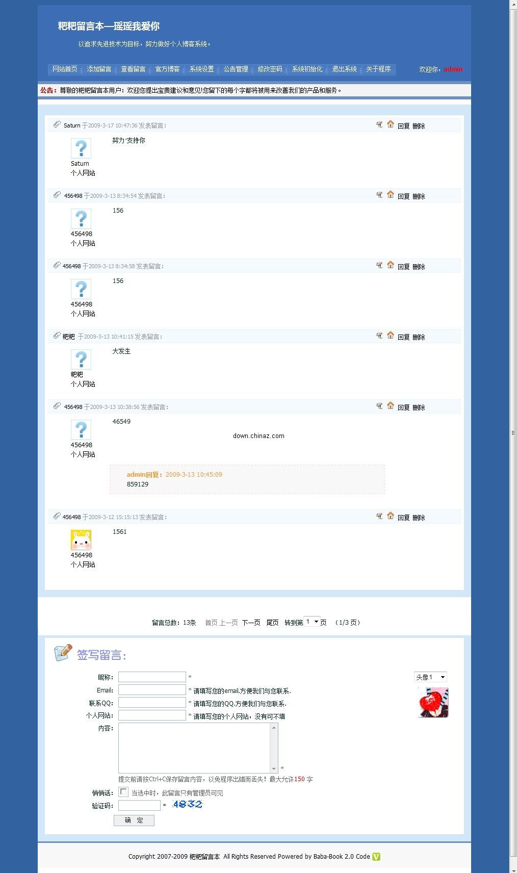 管理員可以后臺(tái)設(shè)置留言本,配置留言本名稱,留言本標(biāo)題,以及更換留言本皮膚功能,以及更換管理員密碼。