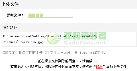 PHP版的圖片上傳程序,因加入了AJAX的功能使得它的上傳體驗更加友好,上傳速度快,無刷新一次上傳3張JPG或GIF格式的圖片,很容易就能嵌入到你的程序中。