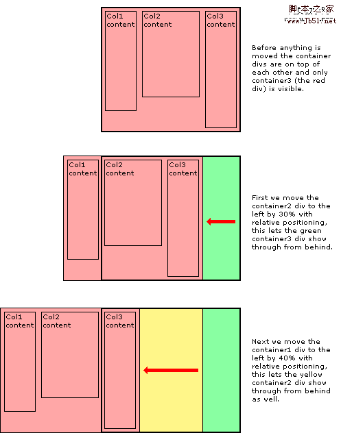 現(xiàn)在用相對(duì)定位把容器移至新的位置。移動(dòng)后 div 如下圖所示。即等高列背景容器的層疊和位置。為了顯示右側(cè)的綠色列 container2 向左移了30%,為了顯示中間的黃色列 container1 向左移動(dòng)了40%,與此同時(shí)紅色部分依然可見作為左側(cè)列。