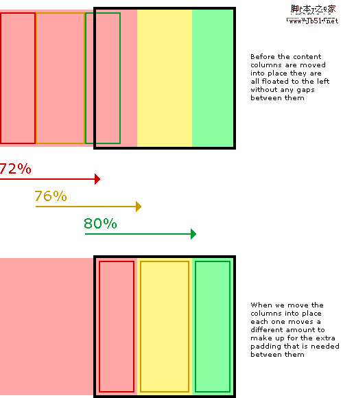 不過不用擔(dān)心...我們可以用完全不依賴于 padding 的方法來解決這個(gè)問題。相反,我們把列弄窄一點(diǎn)(列寬減去兩側(cè)的 padding),之后用相對(duì)定位把它們移至正確的位置。在我們的例子中我們用了 2% 的 padding,則 30% 的列將減至 26%,40% 的列減至 36%。用相對(duì)定位移回列時(shí)需謹(jǐn)記,現(xiàn)在列變窄了,所以當(dāng)它們一起像最初那樣左浮動(dòng)時(shí),每一個(gè)需要比上一個(gè)移動(dòng)更遠(yuǎn)的距離。