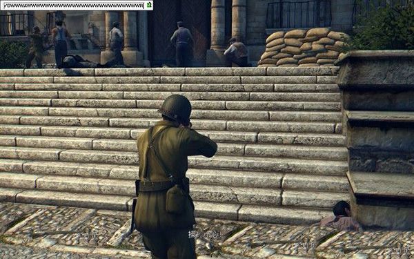 拿上武器之后,按Ctrl躲在門右邊,以墻為掩體,射擊樓梯上的敵人,全部清理完之后上二樓。