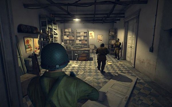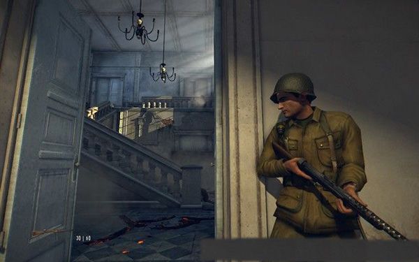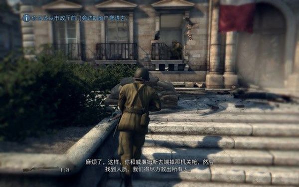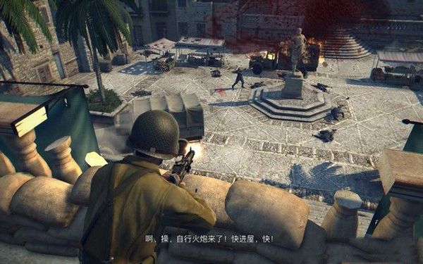 去房間的陽臺,架起MG42機槍,這種重機槍射速非??欤梢苑浅8咝У卮驌魯橙?,不過,因為敵人數(shù)量很多,你很容易受到傷害,可以將下面的卡車射爆,炸死敵人。