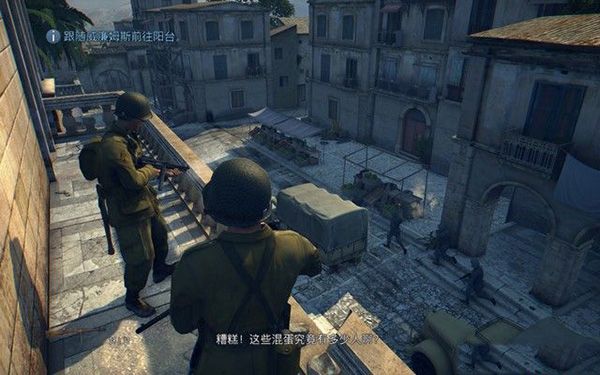 來到陽臺,先和下面的敵軍車隊交戰(zhàn),之后一個敵人突襲,殺死了一個隊友,擊殺房間內(nèi)的敵人之后,大批敵人趕到。