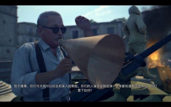 而圖中這個喊廣播的老頭就是一個黑幫大佬,大佬一出現(xiàn),守軍就投降了。