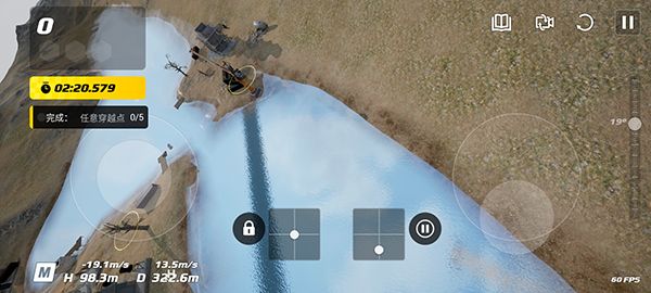 3、游戲界面有左右兩個按鈕,左邊可以控制無人機(jī)的加速方向,右邊可以控制無人機(jī)機(jī)頭的指向;