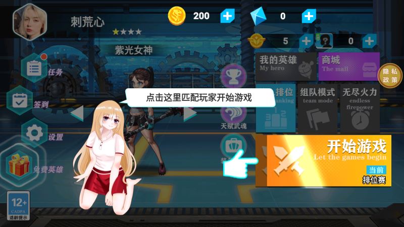 2、在游戲主界面,看到提示【點(diǎn)擊這里匹配玩家開始游戲】,點(diǎn)擊【開始游戲】按鈕。