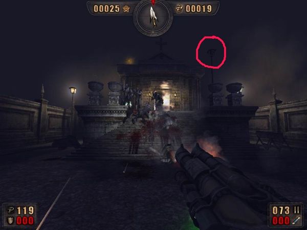第一章第1關(guān):Cemetery(公墓),一個黑暗陰森的墓地.除最后的boss外,所有的怪都是近戰(zhàn)攻擊,拿盾牌的怪有復(fù)活剛被你殺死的骷髏的能力。神秘地點一:在一個建筑的頂部,用2號武器攻擊紅圈中的燈,讓它靠到建筑上。