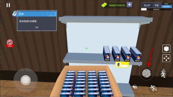 4、對準(zhǔn)箱子之后點擊箭頭指向的按鈕就可以拿起箱子,然后對準(zhǔn)貨架就可以放上去了。
