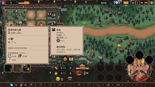6、玩家可建造放置各種設施,如麥田、農民小屋、箭塔等;