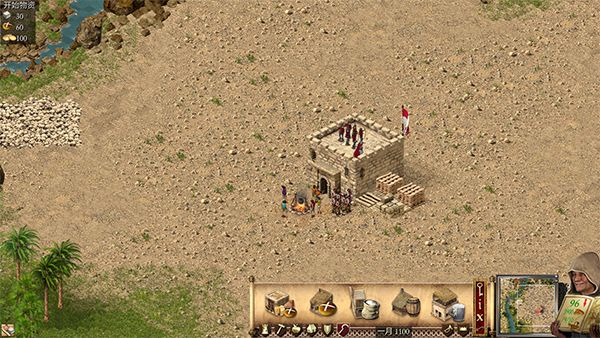 本關只有一小片綠洲,對于新手來講難度非常大的一關。先在綠地那邊造好4座水果農(nóng)場,然后造3座弓箭作坊,以及樹木附近造伐木場,因為本關沒有市場,收入只能通過教堂或額外配給增加稅收,一開始給的那些弓箭手在了望塔上分別守著,并且是進攻姿態(tài),矛兵要在農(nóng)場那邊巡邏,設置防御姿態(tài),然后建造1座武器庫。