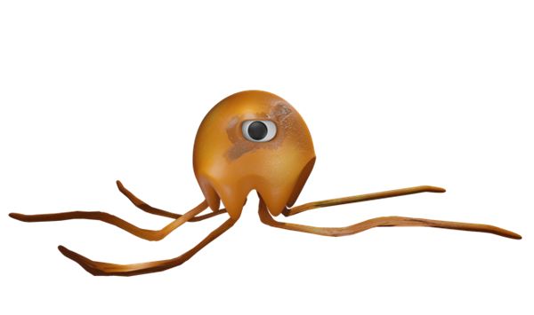 毒刺弗林是一只橙色水母,一只眼睛位于鐘形頭部的中間,與 6 根可伸縮的觸手相連。他的四根觸手向下,另外兩根則以友好的姿勢(shì)舉起在他的頭部?jī)蓚?cè)。
