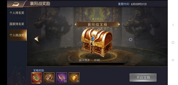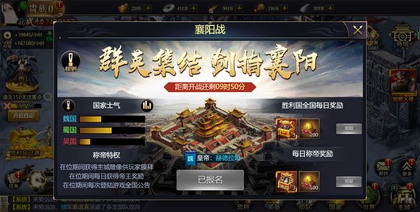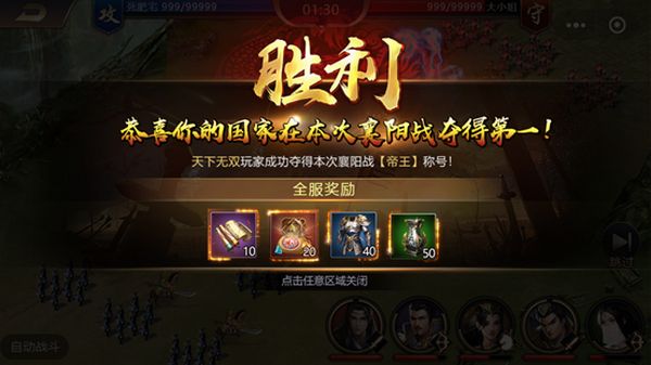 襄陽戰(zhàn)打響從第一次合服第七天開始為第一輪,之后每隔七天打一次。襄陽戰(zhàn)的大獎(jiǎng)是皇帝頭銜,除了皇帝頭銜以外,還有一大堆的排名獎(jiǎng)和參與獎(jiǎng)?;旧现灰M(jìn)去打幾下就能拿到不少突破丹、經(jīng)驗(yàn)書。打贏的國家全國還可以連續(xù)7天領(lǐng)取大量的獎(jiǎng)勵(lì),絕對(duì)是個(gè)大家樂的活動(dòng)!