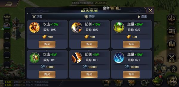 2. 戰(zhàn)斗開始前,右邊的商店里有襄陽戰(zhàn)專屬buff,主力玩家建議全部購買,這樣得到的加成,可以讓主力玩家在襄陽戰(zhàn)里如一把利刃,削鐵如泥