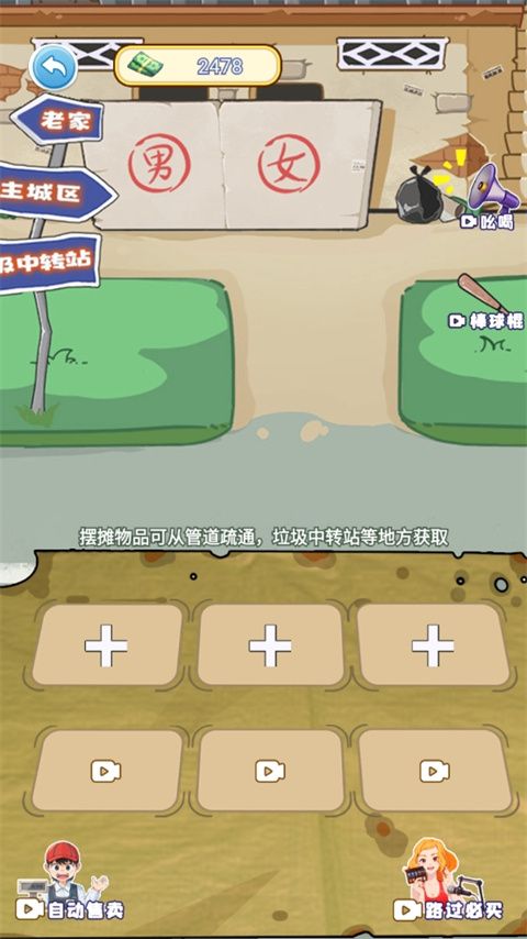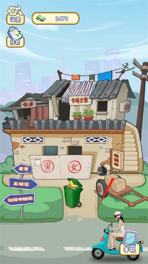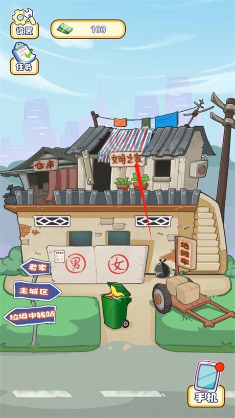 5、然后就會(huì)進(jìn)入垃圾中轉(zhuǎn)站,點(diǎn)擊翻一番,點(diǎn)擊屏幕就能賺錢(qián)或是得到拾荒物品,你可以將拾荒物品拿來(lái)擺攤;