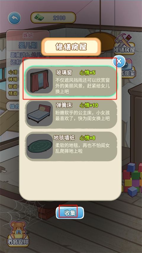 ④修繕?lè)课荩弘姛襞荩ㄐ那?5)、玻璃窗(心情 +2)(垃圾站)、彈簧床(心情+10)(垃圾站)、 地毯墻紙(心情+8)(垃圾站)