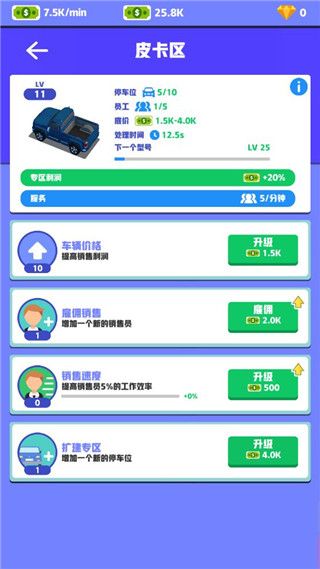 點(diǎn)擊銷售區(qū)域,便可在銷售區(qū)域里,查閱到車輛駕車、雇傭銷售、銷售速度、擴(kuò)建賺取等等,通過升級(jí)可以增加銷售的利潤(rùn)以及產(chǎn)品的豐富性哦~