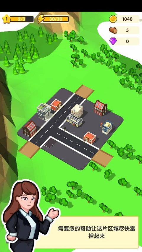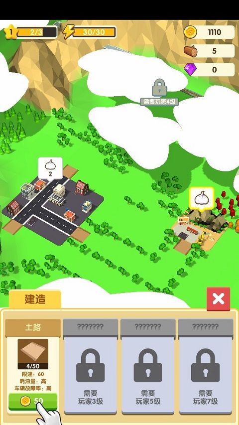6、城市升星還需用到建筑材料,點擊地圖上的綠色樹木,即可砍伐,砍伐到一定數(shù)量,便可將樹清理掉,同時也能獲得建筑材料。在往后的道路建設(shè)中,同樣需要依靠這樣的操作,清除阻礙。