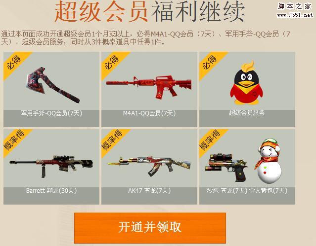 4.通過本頁面成功開通超級會員1個月或以上,必得M4A1-QQ會員(7天)、軍用手斧-QQ會員(7天)、超級會員服務,同時從3件概率道具中任得1件。