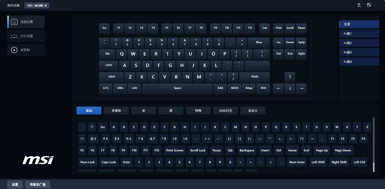 主流的機(jī)械鍵盤都需要安裝驅(qū)動來進(jìn)行個性化設(shè)置,而微星則另辟蹊徑,僅需通過網(wǎng)頁驅(qū)動(https://www.msi.hsgaming.cn/)即可完成設(shè)置,點(diǎn)擊“連接鍵盤”按鈕之后,就可以快速完成按鍵自定義、燈光調(diào)節(jié)、宏設(shè)置等操作,大幅簡化設(shè)置流程,操作簡單方便。