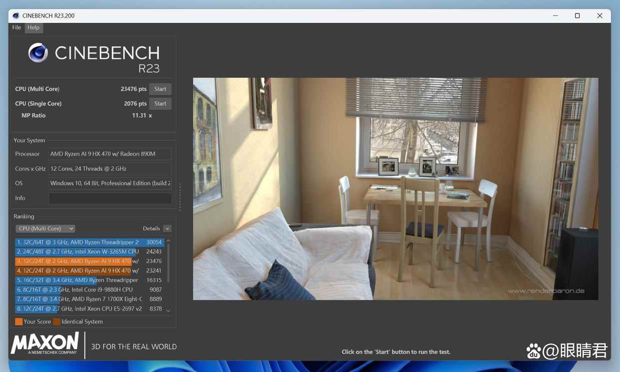 CineBench R23測試,單核成績?yōu)?076,多核成績?yōu)?3476。