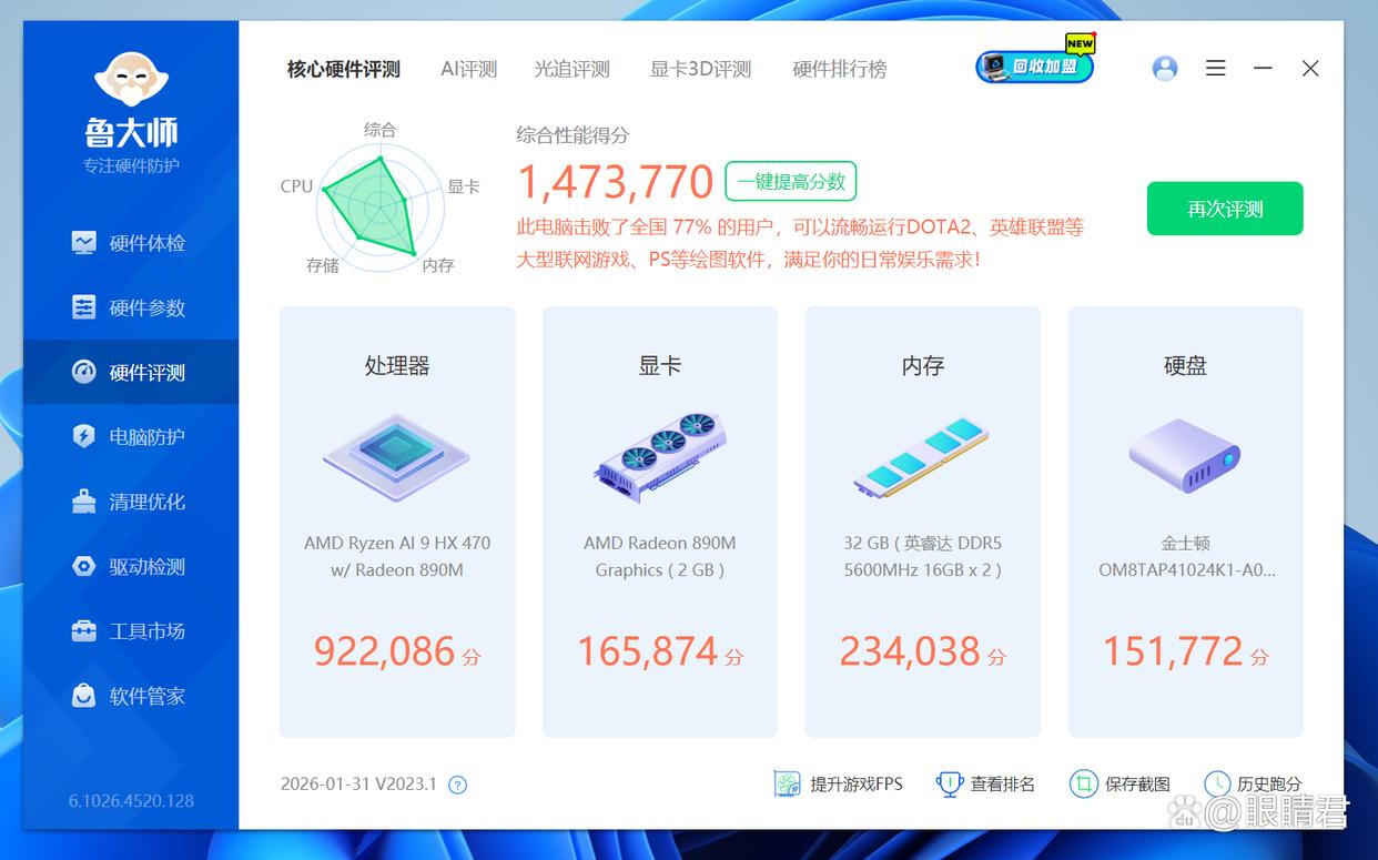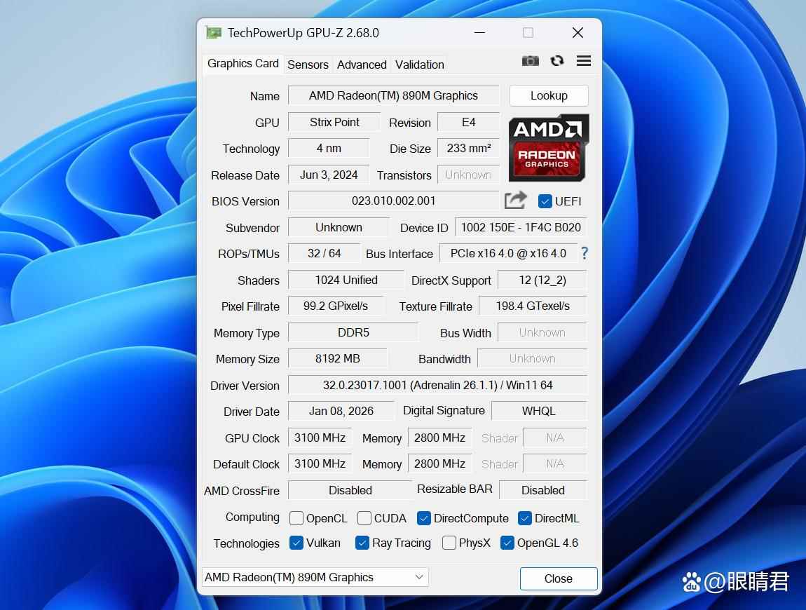 核顯信息,Ryzen AI 9 HX 470內置的Radeon 890M核顯,相比上一代HX 370里的Radeon 890M,頻率從2.9Ghz頻率提升到了3.1GHz,性能更強,在1080P分辨率下可以暢玩許多熱門游戲大作。