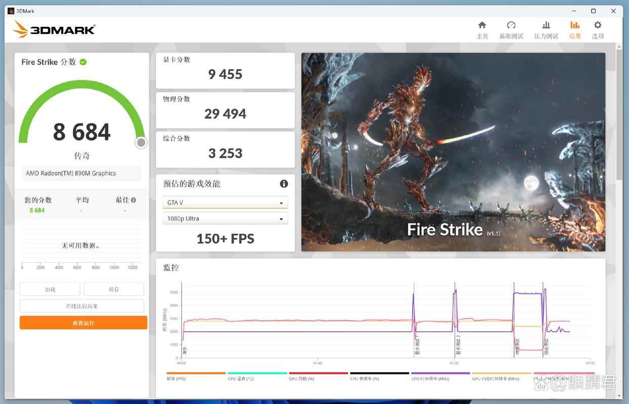 核顯性能測試,針對DX11性能的Fire Strike測試中得分8684分,其中顯卡得分9455,《GTA V》游戲預估在1080P下能獲得150+FPS的幀率表現(xiàn)。