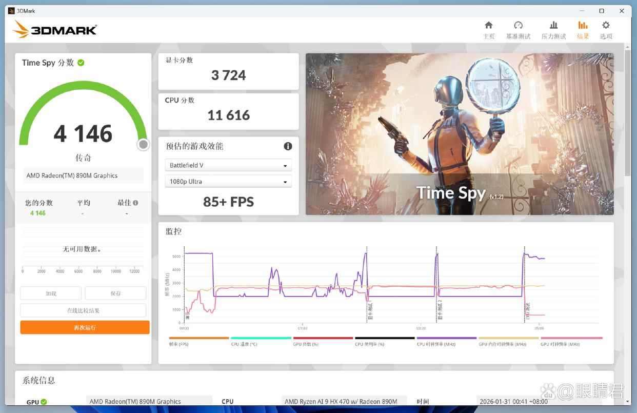 在針對DX12性能的Time Spy測試中得分4146分,顯卡得分3724。