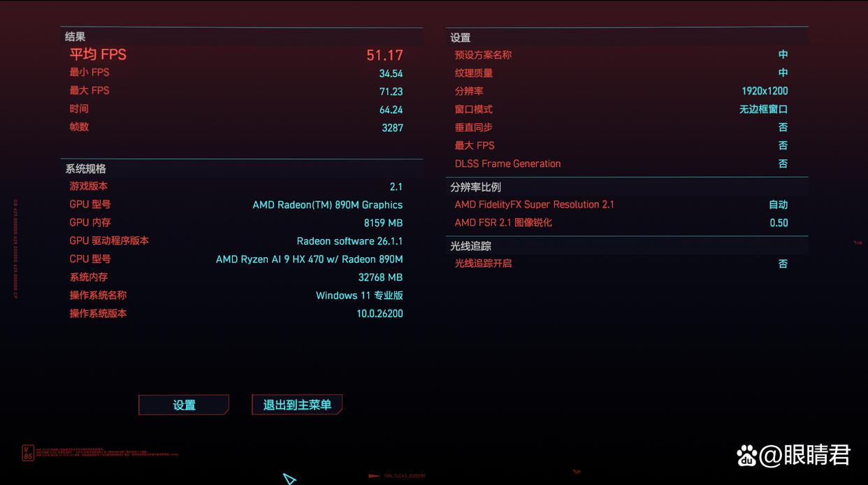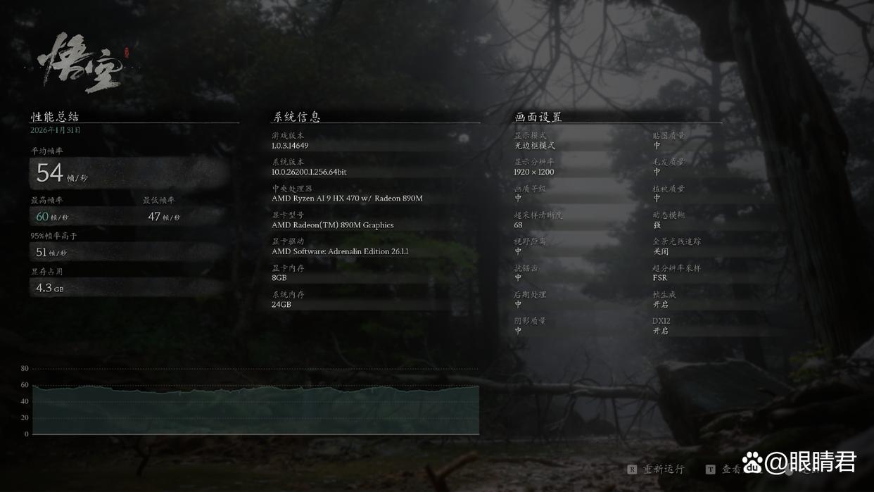 在1920x1200分辨率(大于1920x1080P)下,使用《黑神話·悟空》BENCHMARK測試工具,在中畫質下,平均幀率為54幀/秒,最低幀也能到47幀/秒。