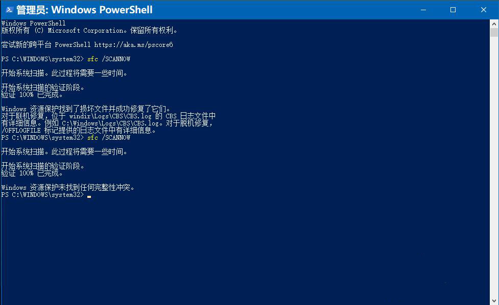 在管理員Windows PowerShell 窗口中輸入 sfc /SCANNOW 命令,按下鍵盤上的回車鍵,待其運(yùn)行完成,顯示 資源保護(hù)未找到任何完整性沖突 即可,如沒有顯示可重復(fù)使用sfc /SCANNOW 命令,直至顯示 資源保護(hù)未找到任何完整性沖突。