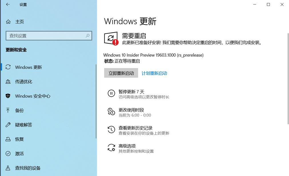 Windows 10 Insider Preview 19603.1000(rs_prerelease) 狀態(tài):正在等待重啟點(diǎn)擊:立即重新啟動(dòng)