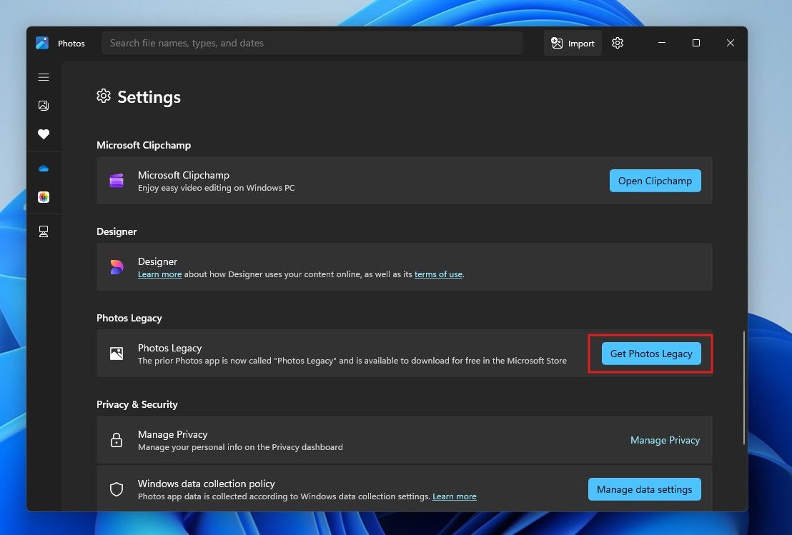 3、向下滾動頁面,點擊“獲取照片(舊版)”按鈕。