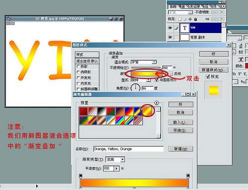 2、我們用圖層混合選項(xiàng)中的“漸變疊加”,會出來一個窗口,雙擊“黑白漸變”就會出來,很多顏色漸變的選擇窗口,我們選擇“黃橙漸變色”~~~漸變方向可以自由選擇。