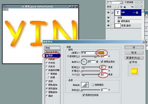 3、我們再用圖層混合選項(xiàng)中的“陰影”,顏色、距離、大小都按照我圖中標(biāo)示的調(diào)整。距離:11,大?。?0 。
