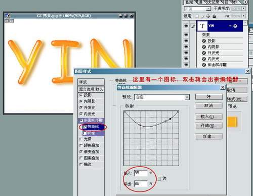 8、最後就是用“等高線”來(lái)調(diào)整文字的光澤,數(shù)值最好是按照?qǐng)D示的調(diào)整,當(dāng)然也可以自由調(diào)整,那樣會(huì)出來(lái)不同的效果,依個(gè)人需要而定。