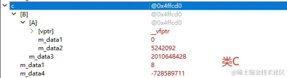 B::vfunc1(),規(guī)律非常簡(jiǎn)單:對(duì)象的虛表指針用來(lái)指向類的虛表,虛表中的指針會(huì)指向其繼承的最近的一個(gè)類的虛函數(shù),所以C的虛表先是指向B的虛表,然后由于重寫(xiě)虛函數(shù)的原因,會(huì)修改其中一個(gè)指針的值。