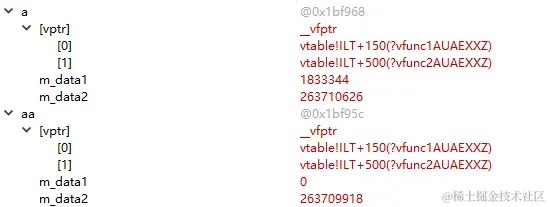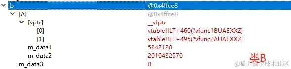 記住:虛表是屬于類的,上面代碼的虛表通過(guò)IDE調(diào)試模式如下: