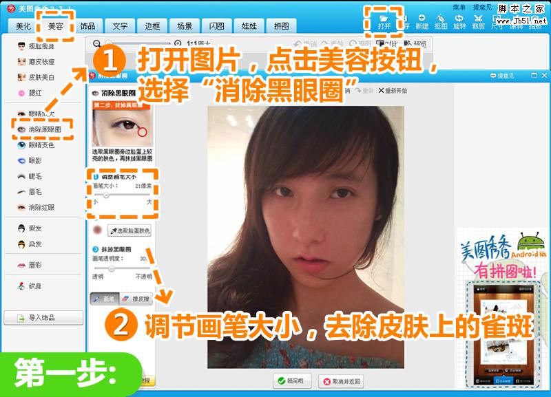 1、在“美圖秀秀”軟件中打開待處理的照片,進(jìn)入“美容”菜單,點(diǎn)擊“消除黑眼圈”,調(diào)節(jié)適當(dāng)?shù)漠嫻P力度和大小,祛除臉上明顯的斑點(diǎn)。