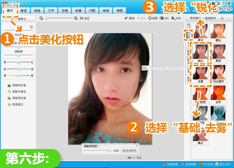 6、進(jìn)入“美化”菜單下,選擇“基礎(chǔ)-去霧”和“銳化”特效,輕松使照片更清晰。