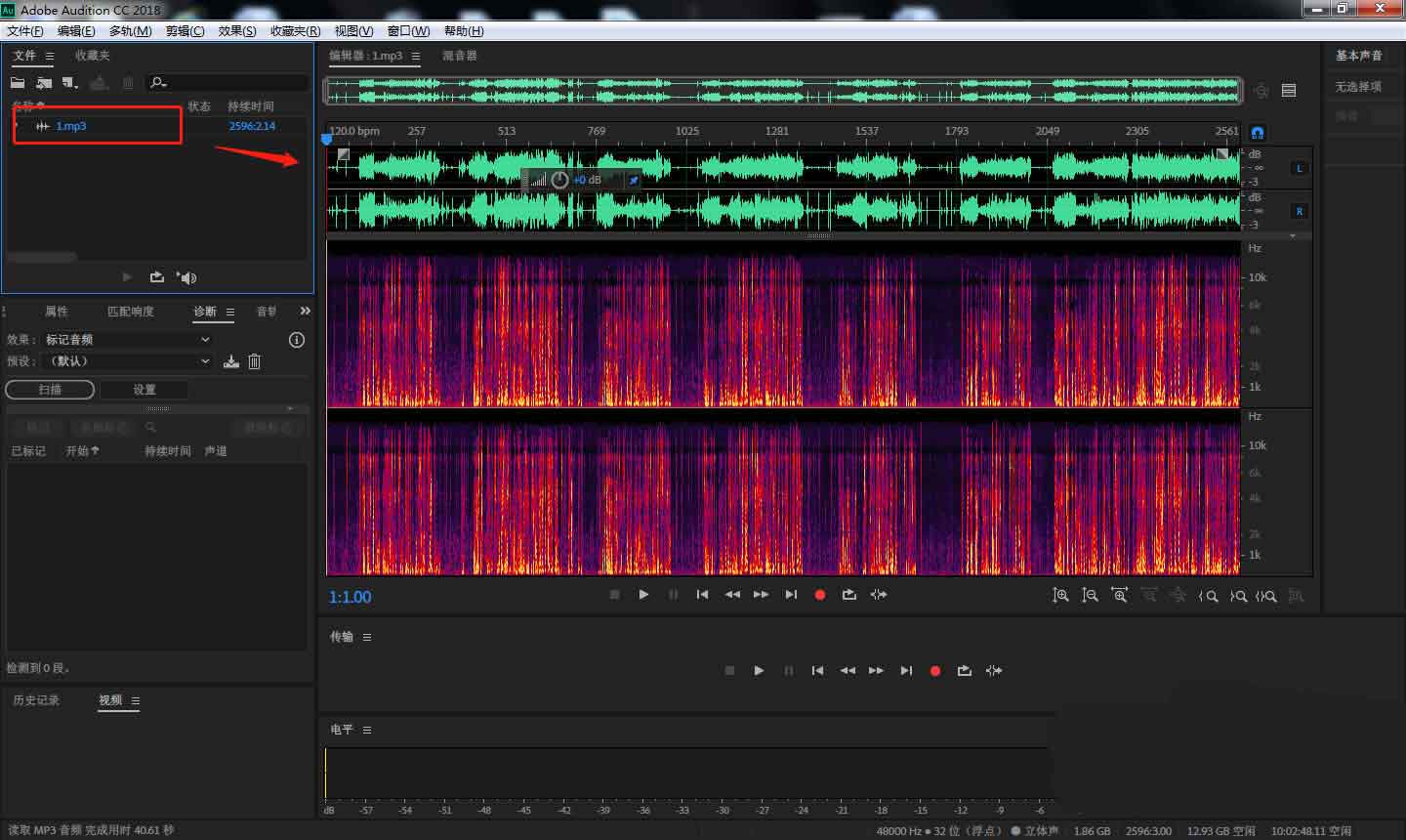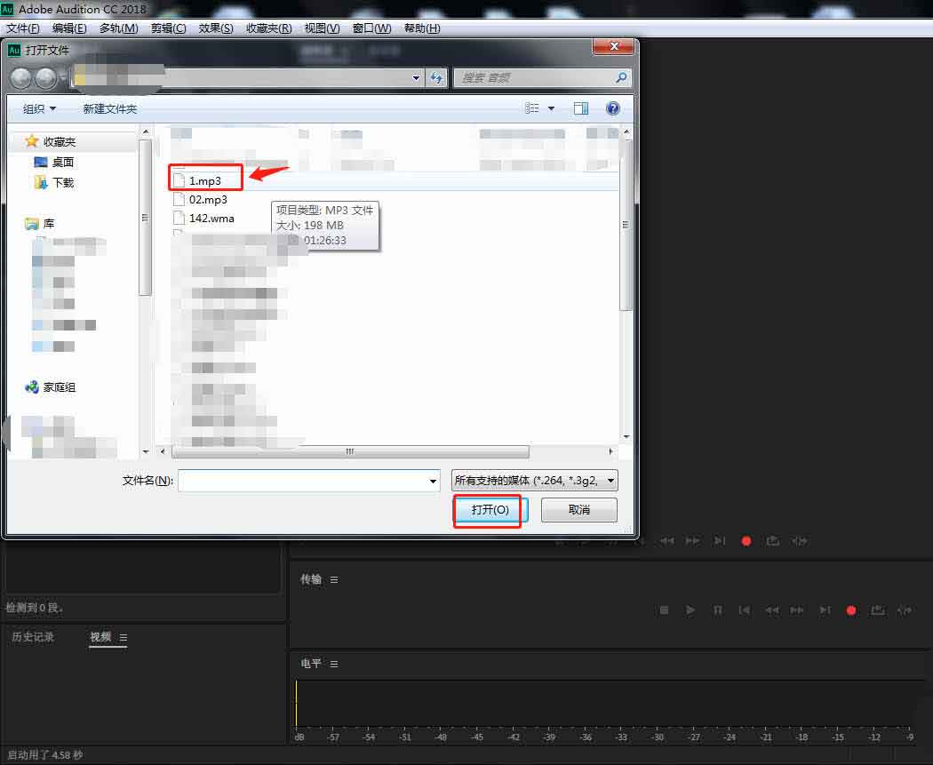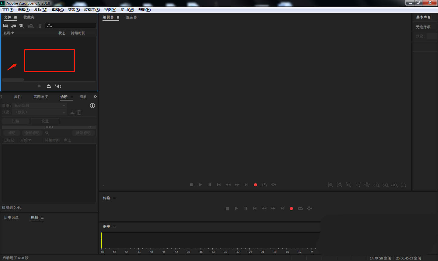 1、首先在電腦中打開AU軟件,點(diǎn)擊左上方區(qū)域,將需要的音頻文件素材導(dǎo)入。