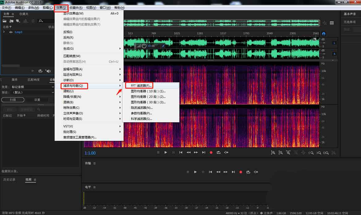 4、點(diǎn)擊頂部工具欄中“效果”——“濾波與均衡”——“FFT濾波器”。