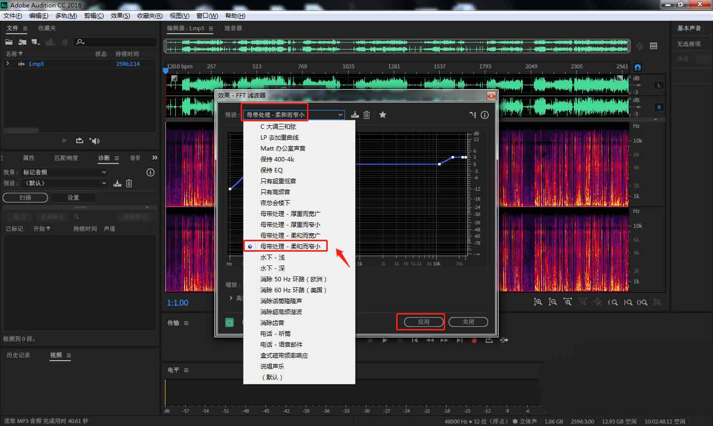 5、在彈出的窗口中將預(yù)設(shè)設(shè)置為“母帶處理-柔和而窄小”,然后點(diǎn)擊應(yīng)用按鈕。
