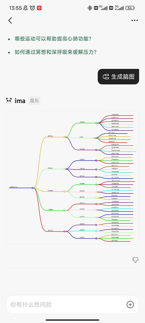 在對(duì)話底部的功能欄中點(diǎn)擊“生成腦圖”,或直接在輸入框中發(fā)送“生成腦圖”,即可基于當(dāng)前內(nèi)容生成腦圖。