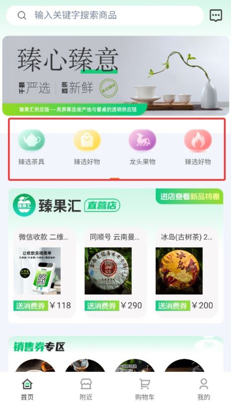 2、在首頁(yè)功能區(qū),可瀏覽臻選茶具、好物推薦、龍頭果品等精選商品。