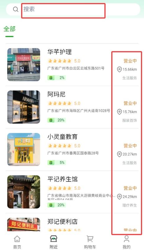 3、通過(guò)附近商家搜索,可查找周邊營(yíng)業(yè)中的店鋪并查看實(shí)時(shí)距離信息。