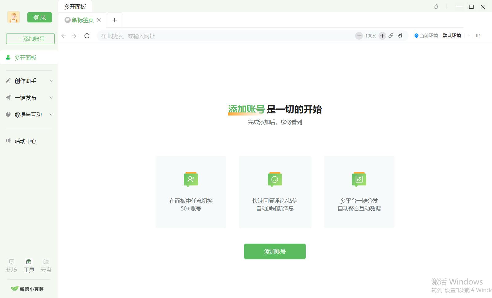小豆芽支持50多個自媒體平臺的賬號登錄和多開管理,進入軟件后可在多開面板——添加賬號,選擇需要添加的平臺然后掃碼登錄對應的自媒體賬號,如果有多個自媒體賬號需要添加重復以上操作即可,添加成功的自媒體賬號會顯示在默認列表里面。注意:小豆芽軟件不支持多開(一臺電腦不支持同時登錄多個小豆芽軟件)